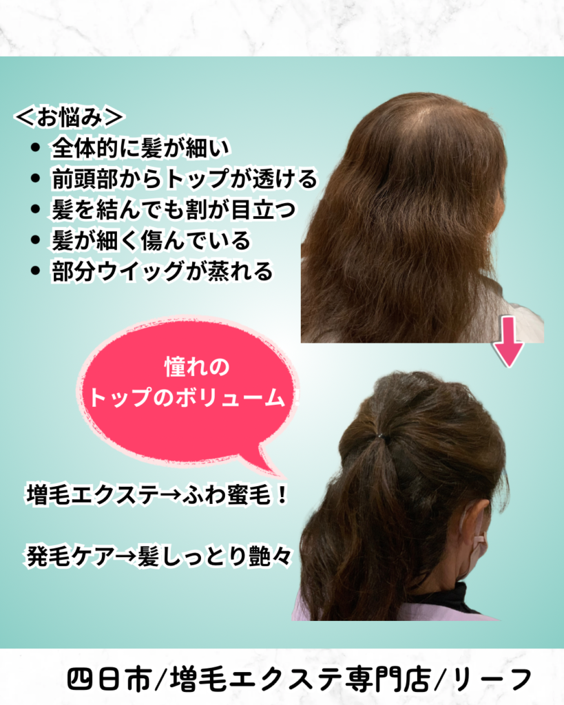 四日市で増毛エクステを検討中の方へ。60代女性が繊細な前頭部の増毛エクステ(エアエク)から実感した自然なボリュームアップの変化と、発毛ケアをご紹介します。